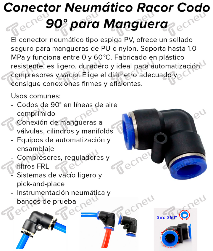 Conector Neumático Racor Codo 90° PV6/PV8 para Manguera de 6mm-8mm