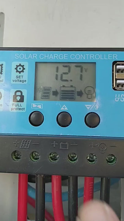 ESPECIFICACIONES TÉCNICAS | • Voltaje de trabajo: 12 ~ 24 V • Voltaje máximo PV: 50 V • Corriente de trabajo: 30 A • Temperatura de trabajo: - 35 ~ 60° C • Microcontrolador industrial integrado • Gran pantalla LCD, todos los parámetros ajustables • Chip de control SOC de optimización inteligente • Gestión de carga PWM de 4 etapas • Protección de corriente inversa mosfet doble, baja producción de calor • Asegúrate de que la batería tenga suficiente voltaje para que el controlador pueda reconocer el tipo de batería antes de la primera instalación |