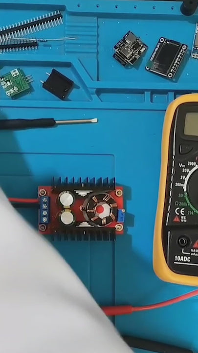 El convertidor de voltaje DC-DC Step-Up 6A 150W tiene como función entregar un voltaje de salida constante superior al voltaje de entrada frente a variaciones del voltaje de entrada o de carga. Soporta corrientes de salida de hasta 6A, voltaje de entrada entre 10v a 32v y voltaje de salida entre 12v a 35v. El voltaje de salida se selecciona mediante un potenciómetro multivuelta.